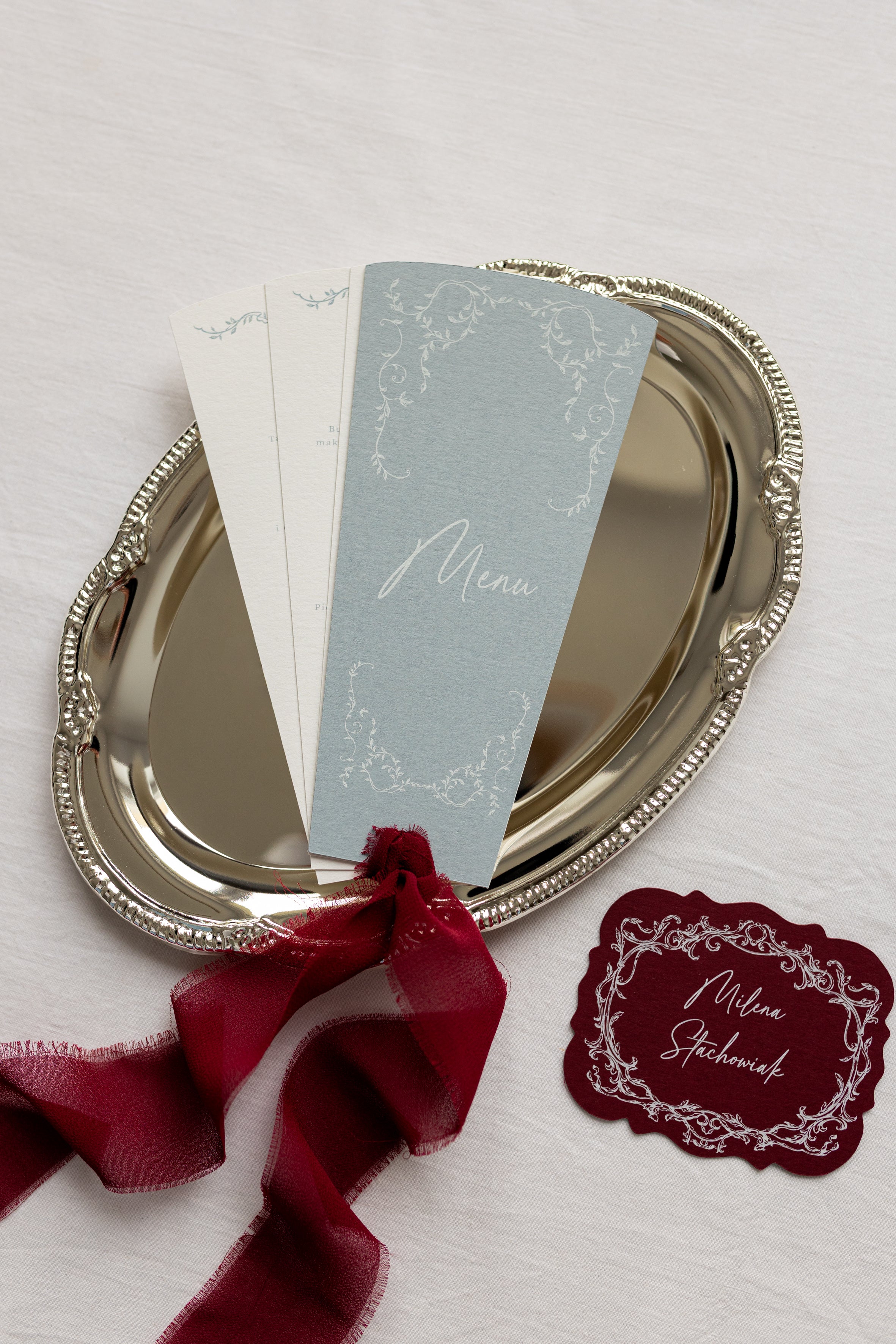 Eleganckie menu w formie wachlarza, które zachwyca nie tylko estetyką, ale i funkcjonalnością. Każda karta to osobna część posiłku, a razem tworzą spójną, dekoracyjną całość przewiązaną tasiemką w kolorze pasującym do stylu przyjęcia. Wachlarz z delikatnym roślinnym ornamentem i klasyczną typografią świetnie sprawdzi się na weselach w stylu vintage, pałacowym czy romantycznym.