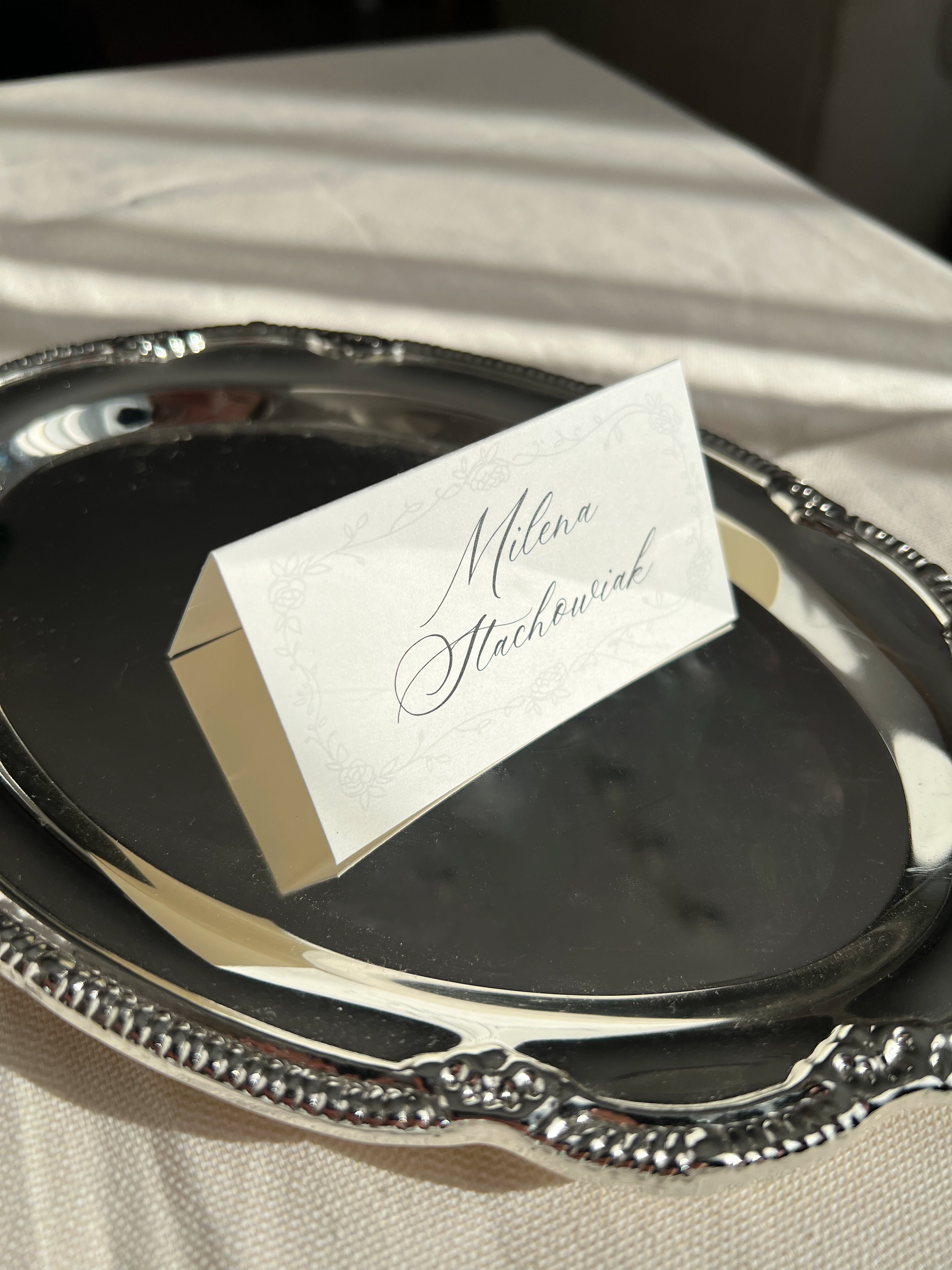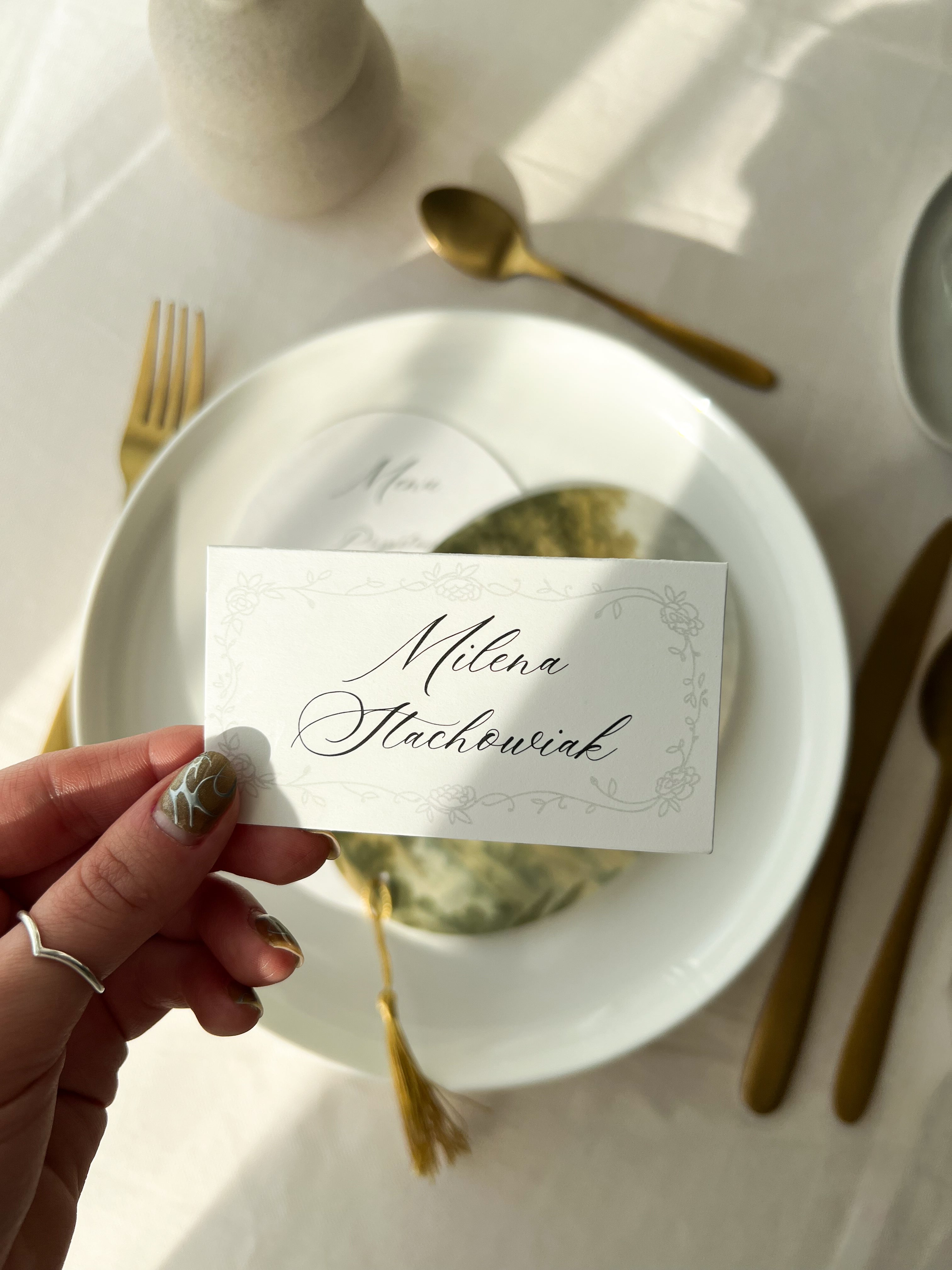 Kolorystykę projektu możemy dopasować indywidualnie do Waszej oprawy ślubu, tak aby idealnie współgrała z pozostałymi elementami papeterii i dekoracji. Winietka najpiękniej prezentuje się w zestawie z owalnym menu z tej samej kolekcji, tworząc spójną i harmonijną kompozycję na stole.