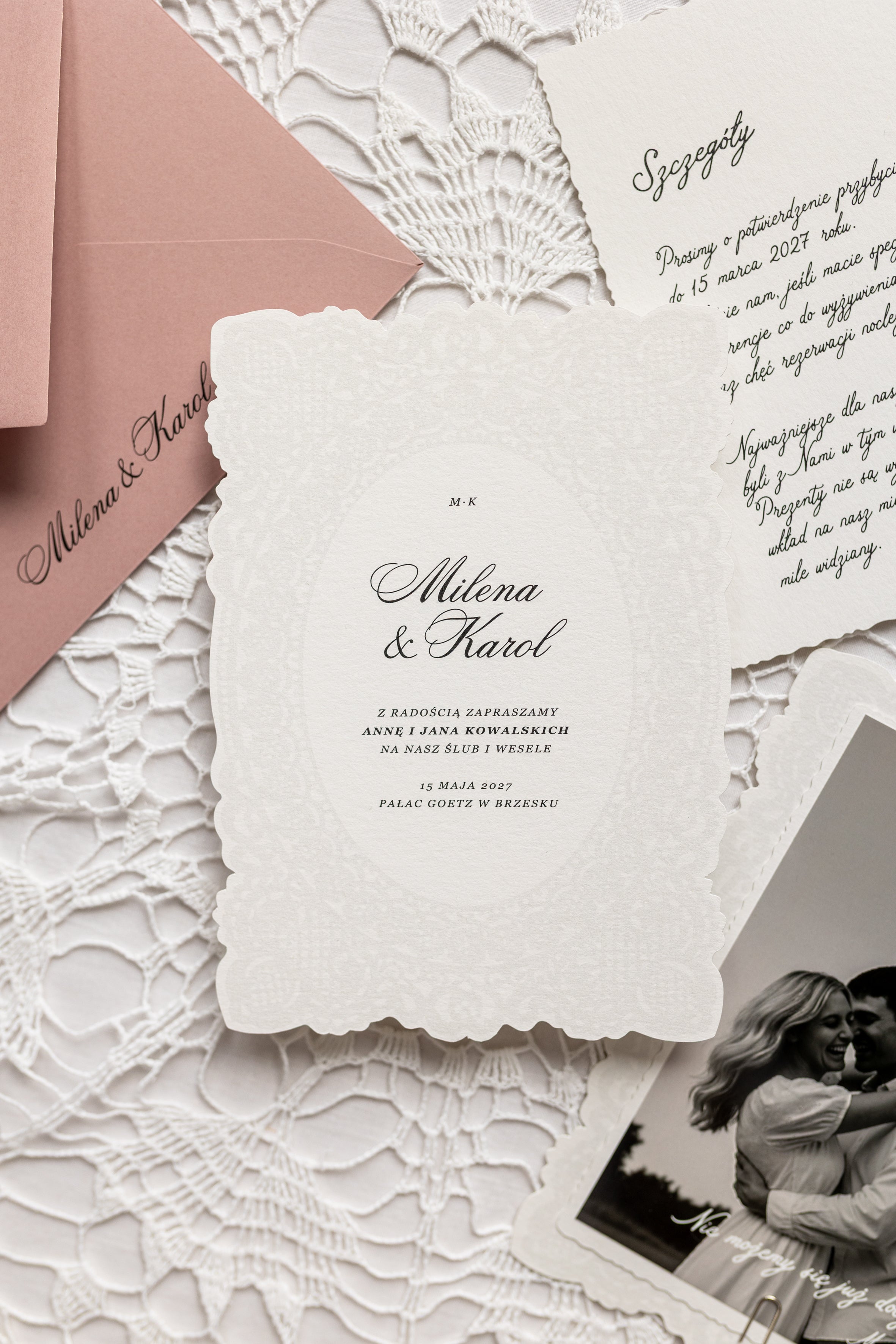 • karta główna z ramką przypominającą delikatną koronkową serwetkę,