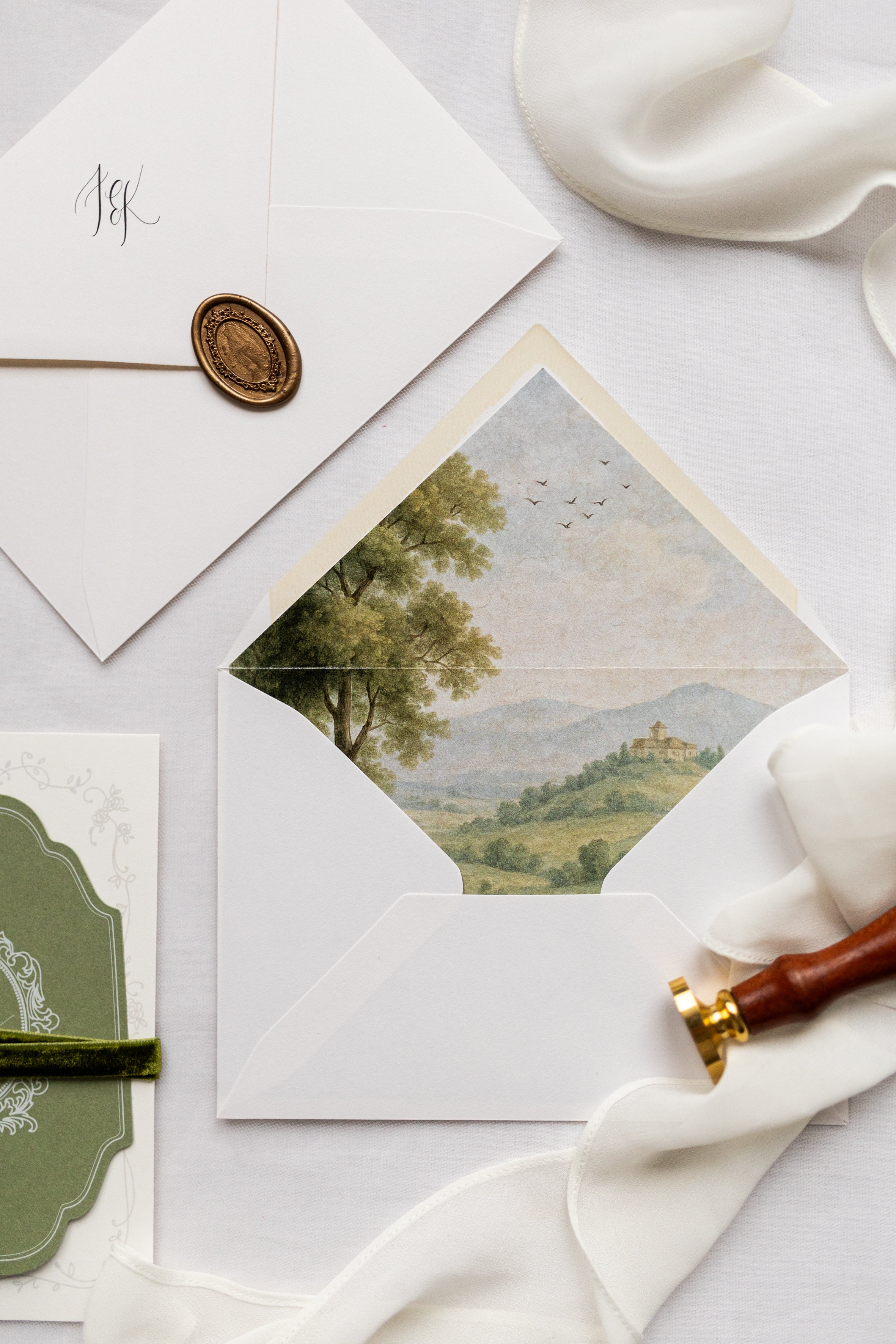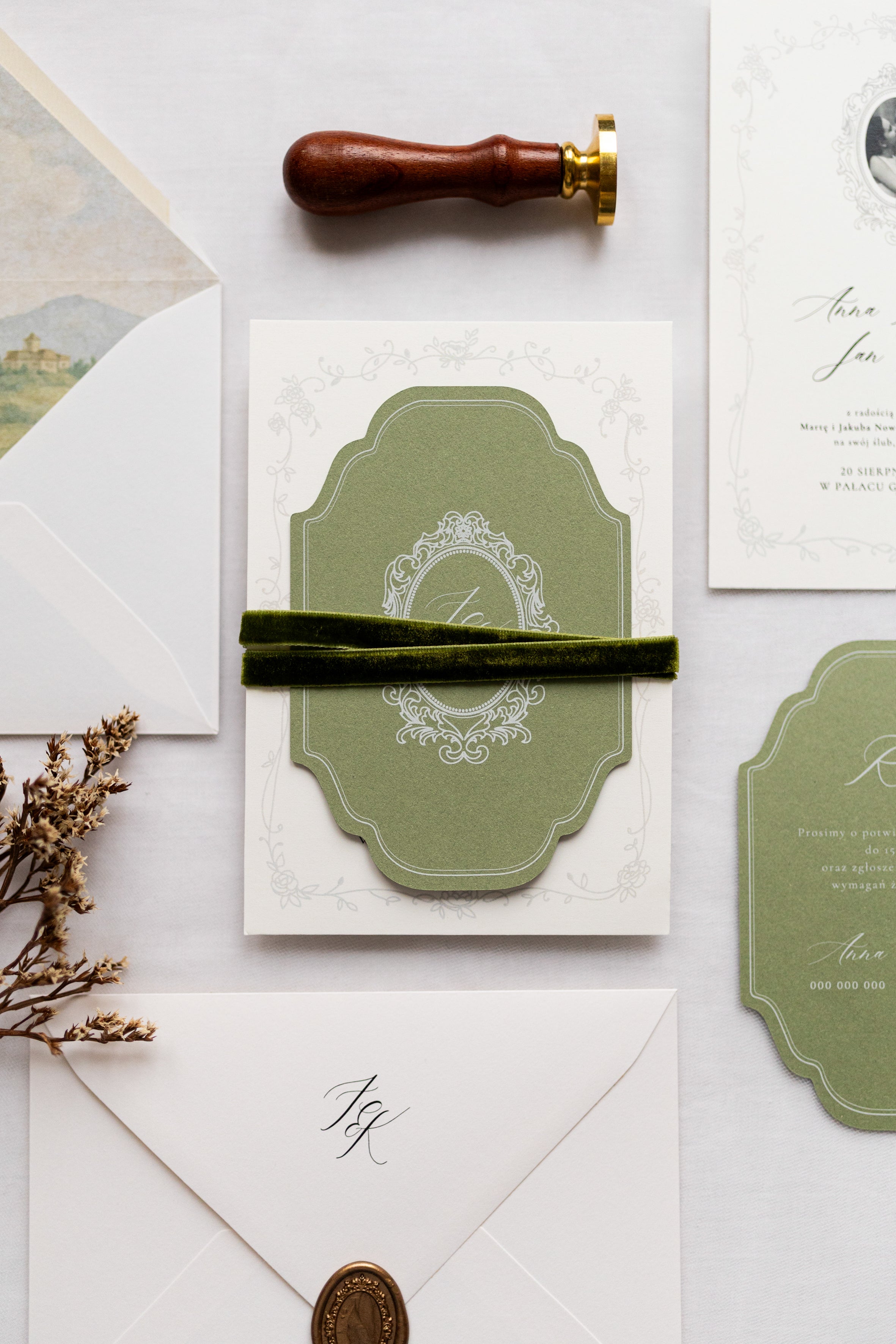 Zaproszenia ślubne z kolekcji Vintage Meadow to ukłon w stronę klasycznego vintage — z nutą romantyzmu i elegancji. Stonowana, szałwiowa zieleń, delikatne ornamenty i akwarelowa ilustracja tworzą harmonijną kompozycję, która pięknie odnajdzie się w otoczeniu oranżerii, toskańskich ogrodów, winnic, eleganckich stodół czy zabytkowych przestrzeni.